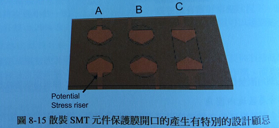 使用鉆孔或開槽、切形在壓合前將保護(hù)膜加工,是軟板制造焊錫襯墊近接區(qū)域的普遍方法。不過如果直接布線進(jìn)入襯墊,保護(hù)膜對(duì)位不良可能導(dǎo)至應(yīng)力提升。圖8-15(A)中,潛在的應(yīng)力提升狀況還是重覆出現(xiàn)。邊緣或轉(zhuǎn)角進(jìn)入襯墊有利于對(duì)位偏移的容忍度(圖8-15(B))。雷射切割或機(jī)械沖壓、切形加工的保護(hù)膜開口,可以做成矩形(圖8-15(C))。