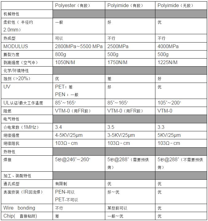 根據(jù)需求的不同,柔性電路板使用的板材也不一樣??梢詮膽?yīng)用的場(chǎng)合及成本等方面加以綜合考慮。常用的有Polyimide(聚酰亞胺,分有膠和無(wú)膠)和Polyester(聚酯)。這幾種材料的特性比較如下表所示: