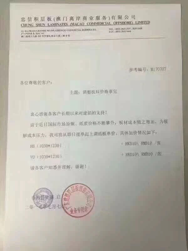 7月7日建滔紙板上調(diào)單價(jià)10元/張