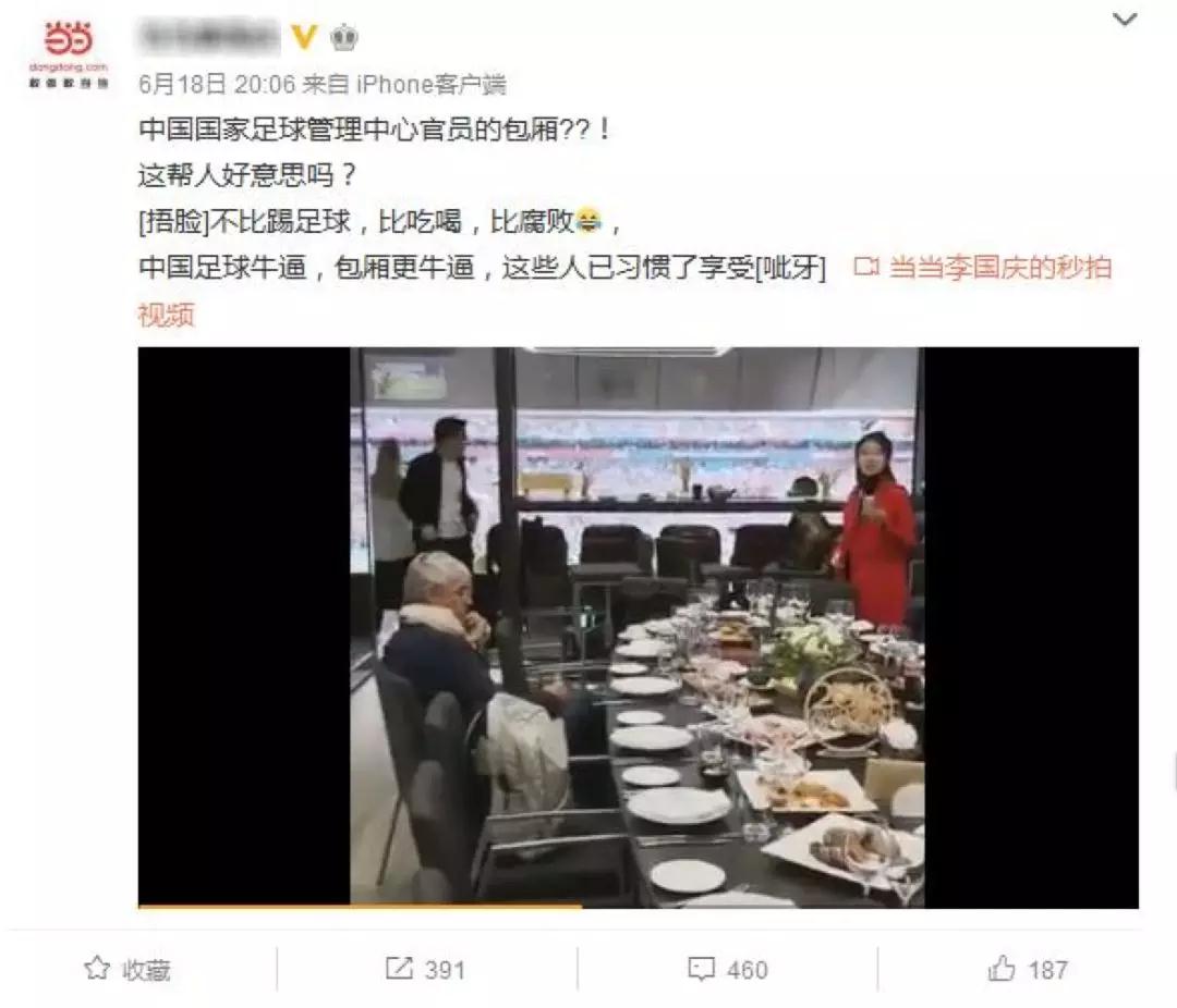 6月18日,網(wǎng)絡(luò)上有人曬出名帥米盧和幾位中國人在世界杯的包廂內(nèi)用餐的視頻,并稱足球管理中心官員伙同米盧在世界杯豪華包廂大吃大喝。一時間,足協(xié)又被推到了風口浪尖。