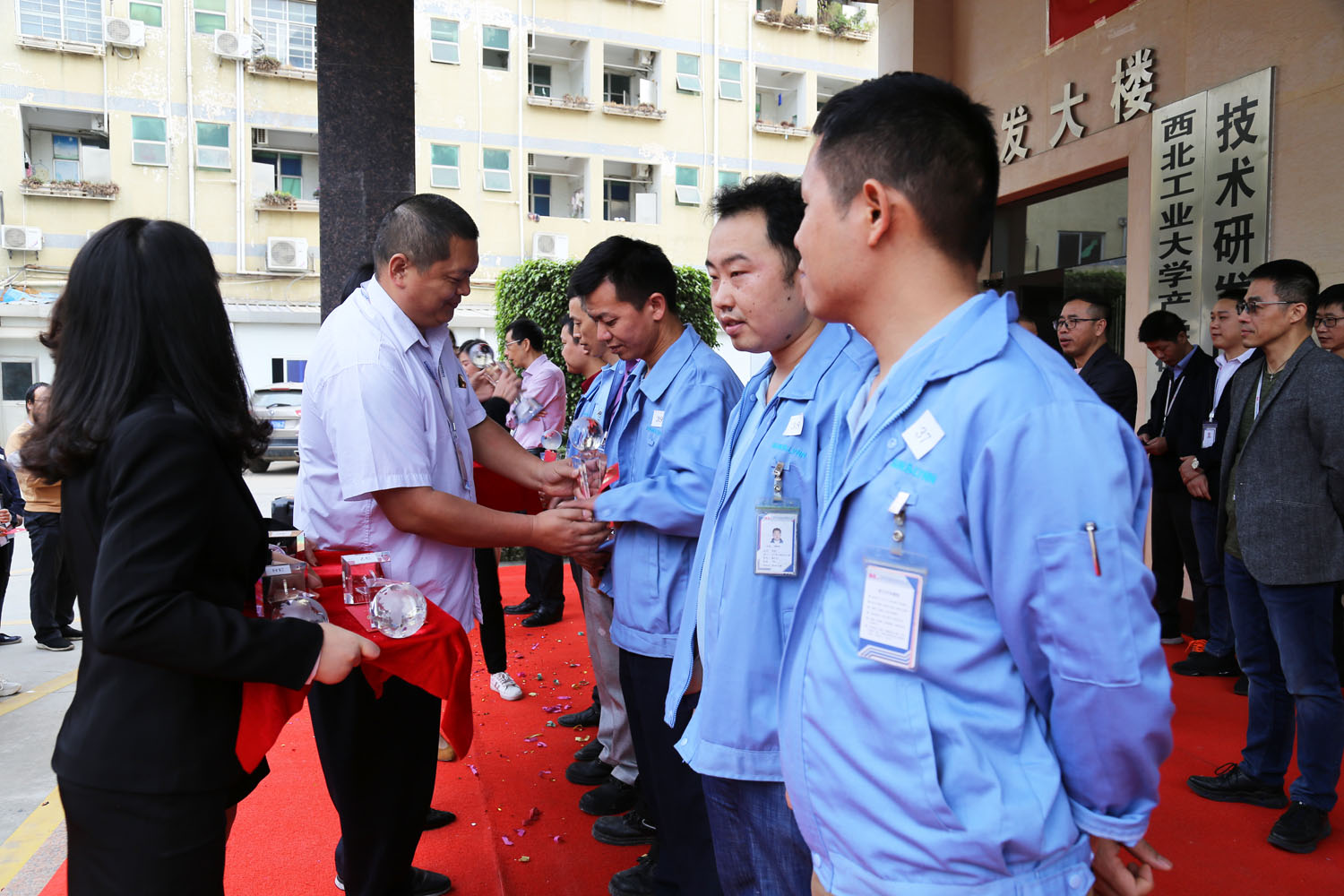 激情昂揚(yáng)的音樂(lè)聲響起,各領(lǐng)導(dǎo)一起為70名職工頒發(fā)榮譽(yù)員工獎(jiǎng)杯和紅包,大家臉上都洋溢著幸福的笑容。