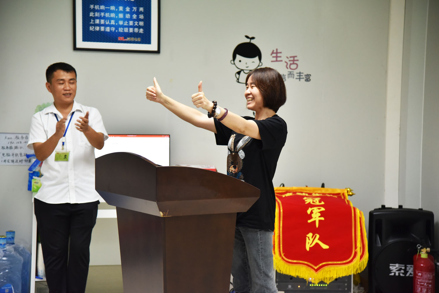 最后就是我們各個戰(zhàn)隊的頒獎儀式了。其中一級KPI,8月達成獎勵目標(biāo)的隊伍每人獎勵3000元,達成挑戰(zhàn)目標(biāo)的隊伍每人獎勵5000元;此次二級KPI達成目標(biāo)的冠軍是最強隊,每人獎勵600元以及全體部門聚餐和錦旗榮譽;亞軍:神鋒隊,每人獎勵400元以及全體部門聚餐和錦旗榮譽;沖鋒隊、快壓隊、夢想隊、精英隊也拿到了屬于自己的那份榮譽!