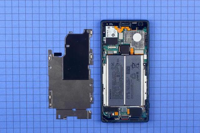 擰下螺絲將蓋板取下,內(nèi)部結(jié)構(gòu)盡在眼前。盡管要從屏幕開(kāi)始拆起,但 Xperia XZ2 采用的依然是安卓手機(jī)非常常見(jiàn)的三段式結(jié)構(gòu), BTB 連接板被設(shè)計(jì)到電池下方,使得整體觀感變得整齊劃一。