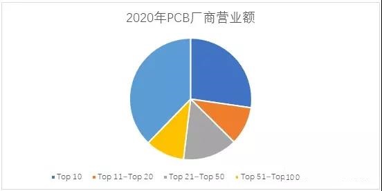 在PCB廠商方面,基于2020年各大廠商的營收情況,全球Top100的PCB廠商2020年總營收約2800億人民幣,占據(jù)全球PCB總產(chǎn)值高達50%以上(2020年全球PCB總產(chǎn)值按4500億人民幣預(yù)估),其中Top10的廠商2020年總營收約1100億人民幣,約占據(jù)Top100廠商總營業(yè)額40%,約占全球總產(chǎn)值的25%;Top10至Top20的廠商2020年總營收約400億人民幣,約占全球總產(chǎn)值的9%,Top20至Top50的廠商2020年總營收約500億人民幣,約占全球總產(chǎn)值的11%。