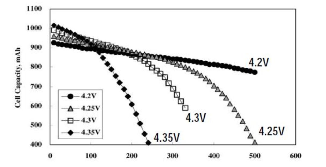 下圖為鋰離子電池的容量、循環(huán)壽命和充電電壓之間的關(guān)系,縱軸為電池容量,橫軸為循環(huán)壽命次數(shù)。可以看出,充電截止電壓越高,循環(huán)壽命更短,容量下降也更快。