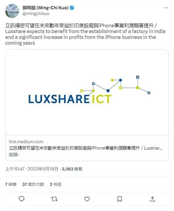 軟板廠深深了解到,知名蘋果分析師郭明錤預(yù)期蘋果將協(xié)助立訊精密在印度設(shè)立產(chǎn)線,立訊精密有望在未來數(shù)年內(nèi)受益于印度市場與供應(yīng)鏈的成長。