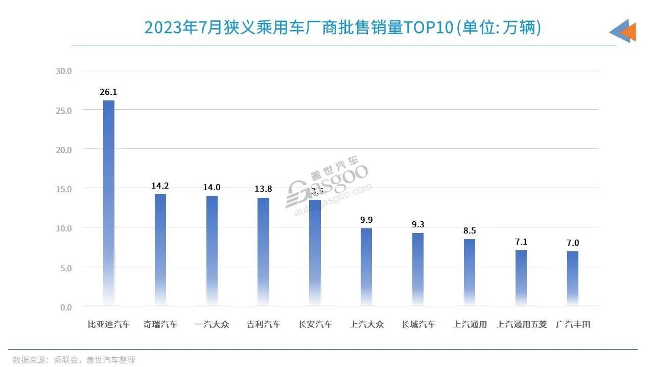 在7月車企銷量前十榜單上,自主和合資登榜的數(shù)量旗鼓相單,但月度銷量冠、亞軍,都被自主車企收入囊中。其中比亞迪依舊是一家獨(dú)大,月銷量超過(guò)26萬(wàn)輛,是7月唯一一家銷量破20萬(wàn)輛的國(guó)內(nèi)乘用車企業(yè)。