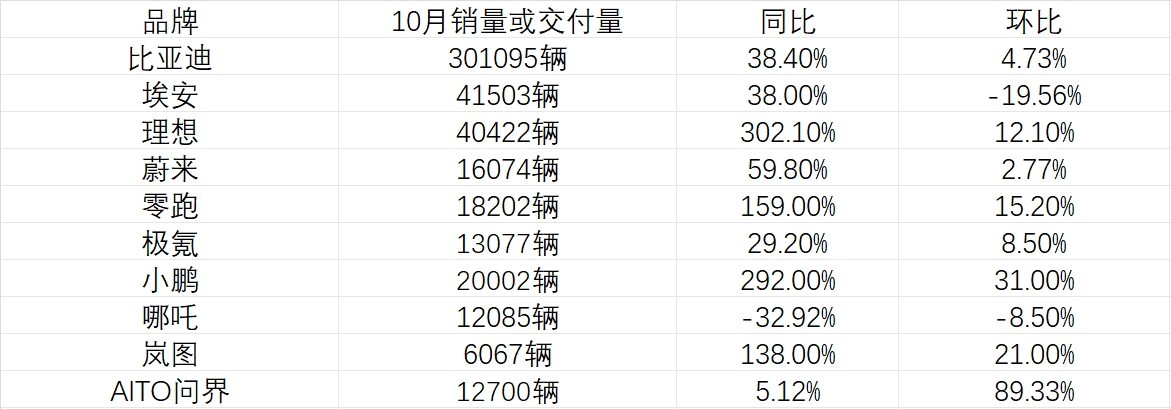 軟板廠了解到,11月1日,新能源車企相繼曬出10月銷售成績單,亮點眾多。比亞迪首次超越30萬輛大關(guān),理想汽車首次突破4萬、小鵬汽車強勢反彈至2萬關(guān)口以上、剛與Stellantis牽手的零跑創(chuàng)單月交付新高、而“遙遙領(lǐng)先”的AITO問界大爆發(fā)如約而至。