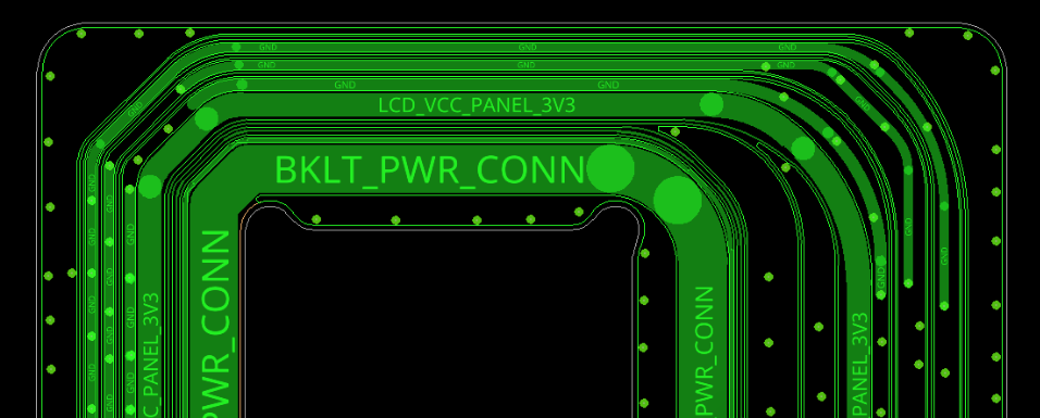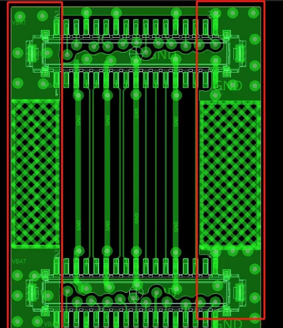 第三點就是要使用網(wǎng)格狀鋪銅,網(wǎng)格狀銅可以保存更好的彎折效果,如下圖所示,上下兩個BTB連接器加強部分鋪全銅,中間彎折部分加網(wǎng)格狀鋪銅。