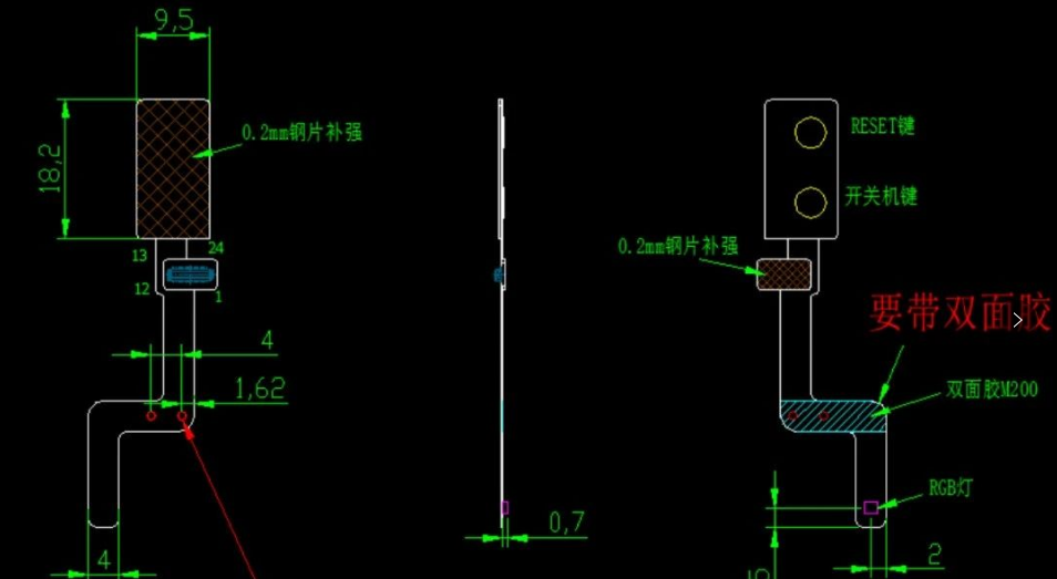 因為FPC軟板很薄,一般雙面板厚度0.08-0.13mm,如果在FPC上貼裝連接器,就需要在連接器下板子的另外一面進行補強,如下圖所示,結構給出的加工圖紙中給出了補強區(qū),在側鍵和BTB連接的背面使用0.2mm的鋼片進行補強設計。