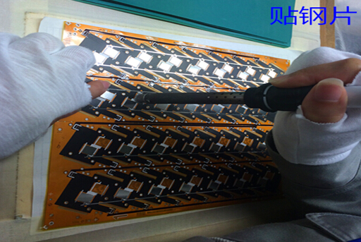 1.貼鋼片:用不銹鋼片貼在軟板相應(yīng)的位置上,用來局部補(bǔ)強(qiáng)該區(qū)域的軟板使其不至于彎折的工藝;