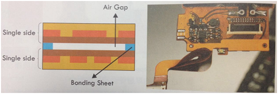 多層FPC結(jié)構(gòu)會失去柔軟度,但是只用單層結(jié)構(gòu)可能無法滿足布線密度,此時為了能夠維持撓曲性又連到高密度連接,就必須使用頭尾壓合中間分離的結(jié)構(gòu)制作FPC 。業(yè)者給這種結(jié)構(gòu)許多不同稱謂,“單單堆疊”、“頭尾相連”、“空氣間隙”等名稱。