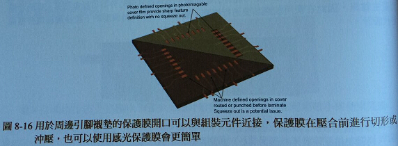 使用鉆孔或開槽、切形在壓合前將保護(hù)膜加工,是軟板制造焊錫襯墊近接區(qū)域的普遍方法。不過如果直接布線進(jìn)入襯墊,保護(hù)膜對(duì)位不良可能導(dǎo)至應(yīng)力提升。圖8-15(A)中,潛在的應(yīng)力提升狀況還是重覆出現(xiàn)。邊緣或轉(zhuǎn)角進(jìn)入襯墊有利于對(duì)位偏移的容忍度(圖8-15(B))。雷射切割或機(jī)械沖壓、切形加工的保護(hù)膜開口,可以做成矩形(圖8-15(C))。