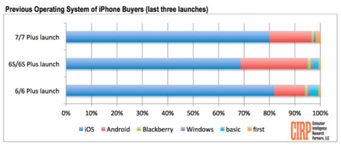 再來看看用戶分布。三代機型中,首發(fā)月銷量最低的iPhone 6s系列,反而是吸引最多Android用戶的,約有26%的銷量是Android用戶貢獻的;iPhone 7系列其次,18%的銷量來自Android用戶;最為成功的iPhone 6系列,Android用戶的銷量占比僅為12%。事實上,蘋果在上個月的電話會議上強調(diào)了iPhone 7系列吸引了更多Android用戶,證明了CIRP數(shù)據(jù)的可靠性。