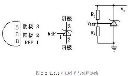 TL431是由德州儀器生產(chǎn)的可控精密穩(wěn)壓源,實物如圖2-3所示。它的輸出電壓用兩個電阻就可以任意的設置到從2.5V到36V范圍內(nèi)的任何值。該器件的典型動態(tài)阻抗為0.2Ω,在很多應用中用它代替穩(wěn)壓二極管,例如,數(shù)字電壓表,運放電路,可調(diào)壓電源,開關電源等。圖2-2所示為TL431引腳排列與使用連線圖。
