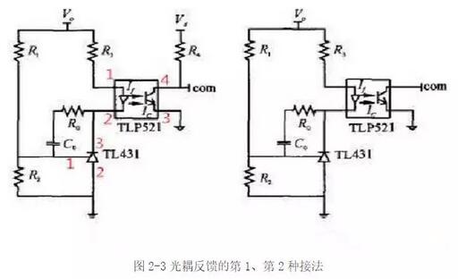 高于反相端電位的形式,利用運放的一種特性—當運放輸出電流過大(超過運放電流輸出能力)時,運放的輸出電壓值將下降,輸出電流越大,輸出電壓下降越多。因此,采用這種接法的電路,一定要把PWM(脈沖寬度調(diào)制)芯片的誤差放大器的兩個輸入引腳接到固定電位上,且必須是同向端電位高于反向端電位,使誤差放大器初始輸出電壓為高。圖2-3所示接法的工作原理是:當輸出電壓升高時,原邊電流If增大,輸出電流Ic增大,由于Ic已經(jīng)超過了電壓誤差放大器的電流輸出能力,com腳電壓下降,占空比減小,輸出電壓減小;反之,當輸出電壓下降時,調(diào)節(jié)過程類似。