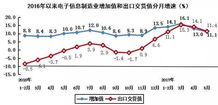 生產(chǎn)實現(xiàn)較快增長。1-5月份,規(guī)模以上電子信息制造業(yè)增加值同比增長13.7%,同比加快4.9個百分點;快于全部規(guī)模以上工業(yè)增速7.0個百分點,占規(guī)模以上工業(yè)增加值比重為7.1%。其中,5月份增速為11.1%,比4月份減緩1.9個百分點。