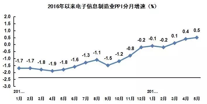 行業(yè)產(chǎn)品價格延續(xù)上漲趨勢。5月份,電子信息制造業(yè)生產(chǎn)者出廠價格(PPI)同比上漲0.5%(去年同期為下降1.8%),延續(xù)3月份以來持續(xù)上漲的趨勢。