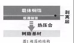 形成模塊基本(IC載板)或智能手機(jī)用的微細(xì)電路圖形,若采用蝕刻工藝由于會(huì)產(chǎn)生側(cè)蝕而影響微細(xì)導(dǎo)體圖形的形成,而采用半加成法或UTC(Ultra-Clad超薄銅箔法)。軟板廠所用UTC法采用的銅箔厚度是3μm左右極薄箔材。通常覆銅板的銅箔厚度即使薄也常是12μm厚,這種12μm厚度的銅箔如作為UTC法之用,也會(huì)產(chǎn)生較大側(cè)蝕而達(dá)不到要求。由于3μm厚的超薄銅箔難于直接使用操作,大都是采用如圖1所示用載體銅箔作襯里的超薄銅箔。將這種材料壓合于基板上以后剝?nèi)ポd體銅箔,然后形成導(dǎo)體圖形。