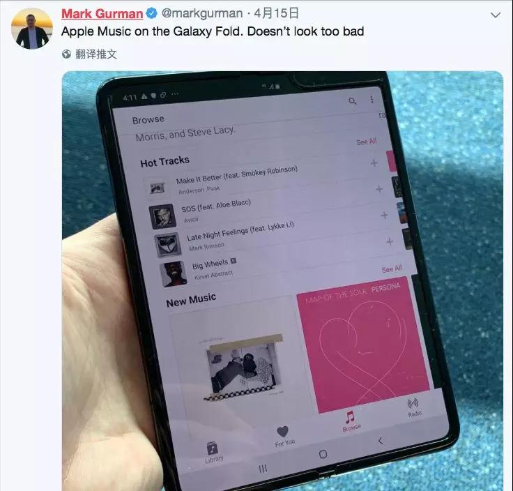 4月15日,Mark Gurman拿到了這款手機,雖然兩塊屏幕中間的折痕比較明顯,但用起來還算不錯。
