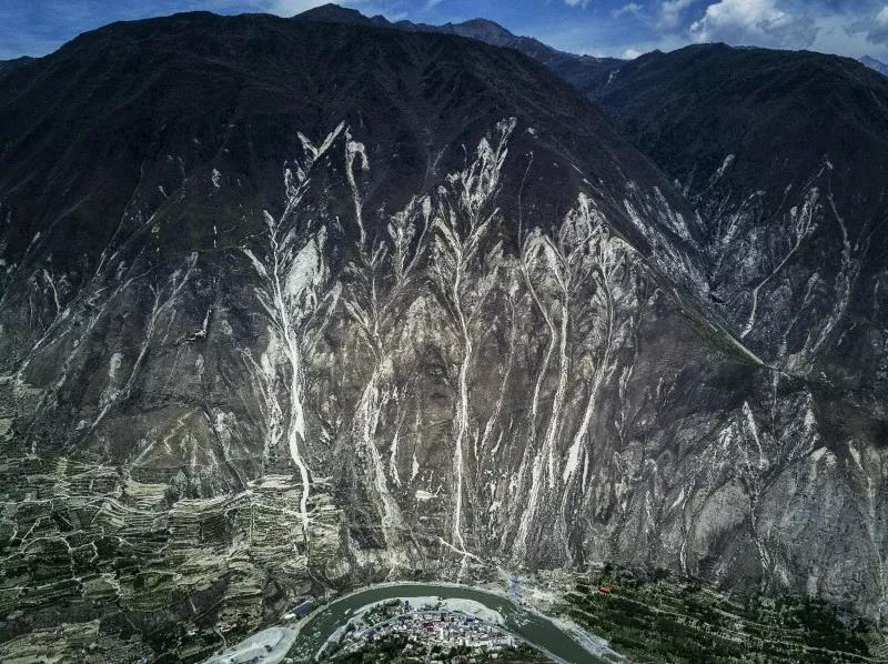 △ 2008年5月12日  汶川縣雁門鎮(zhèn)地動山搖,山體驟然滑落,留下道道溝壑。