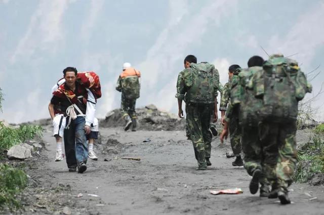 ▲2008年5月13日,北川中學(xué)學(xué)生李陽在武警官兵的幫助下救助自己的同學(xué)。大三時李陽選擇參軍入伍,他說要當(dāng)個好兵,為家鄉(xiāng)人民爭氣。