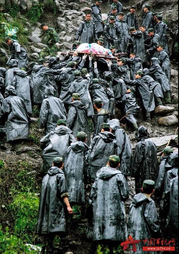 ▲令人難忘的照片《眾志成城 托舉生命》。山體垮塌,亂石滾成了陡坡,一條轉(zhuǎn)移被困人員的必經(jīng)之路被埋,再加上泡了一天一夜的雨,泥濘難行。在轉(zhuǎn)移被困人員時,救援官兵用身體搭起人梯,把生命高高舉過頭頂。