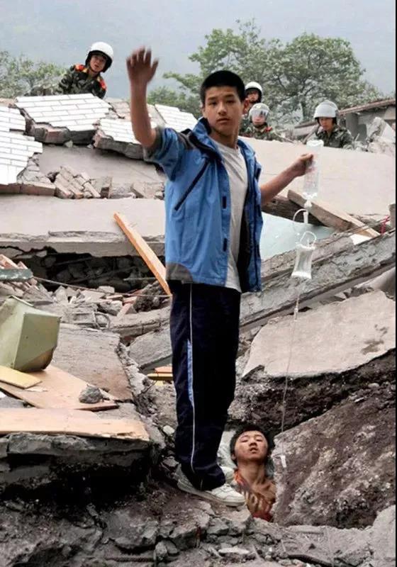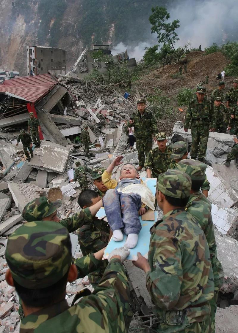 ▲2008年5月15日,綿竹市漢旺東汽中學(xué),災(zāi)難過去80個小時,男孩終于被救援人員抬出廢墟。他說,“叔叔,我想喝可樂”。
