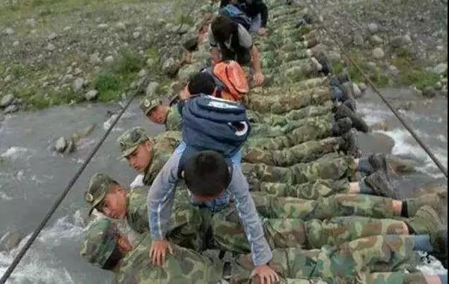 ▲2008年6月,四川省地震災(zāi)區(qū)彭州市湔江河邊,戰(zhàn)士趴在還沒有修完的鐵索橋上,組成臨時的“人橋”,讓小學(xué)生們從自己的脊背上爬過。