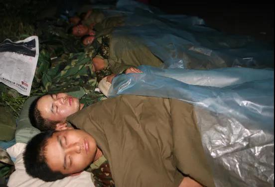 ▲2008年5月15日凌晨,參加抗震救災(zāi)的濟南軍區(qū)某部戰(zhàn)士在汶川縣映秀鎮(zhèn)街頭休息。