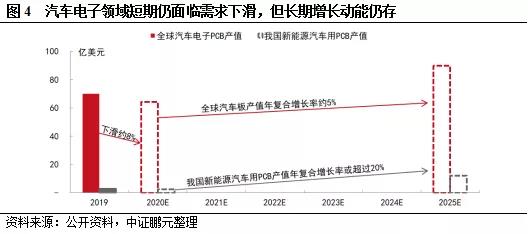 不過長(zhǎng)遠(yuǎn)看,我國(guó)車用電路板仍存在長(zhǎng)期增長(zhǎng)機(jī)會(huì)。根據(jù)工信部2019年12月發(fā)布的《新能源汽車規(guī)劃》提及的發(fā)展愿景,到2025年新能源汽車銷量占比達(dá)到25%(2019年占比不足5%),智能網(wǎng)聯(lián)汽車新車銷量占比達(dá)到30%?;谖覈?guó)政策目標(biāo)的預(yù)期,疊加特斯拉國(guó)產(chǎn)化推進(jìn),以及單輛新能源汽車的PCB用量較普通燃油車用量提升約2倍,未來5年我國(guó)新能源汽車用PCB產(chǎn)值年復(fù)合增長(zhǎng)率有望超過20%。
