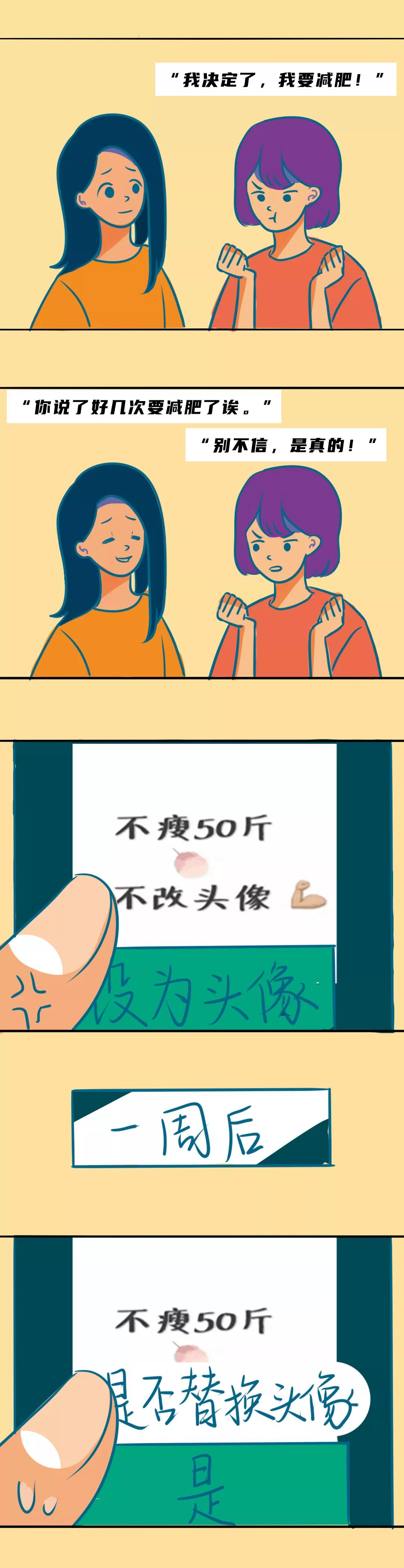 相信好多人都見過那種非常勵志的頭像:全都是“不瘦??斤不換頭像!”。但沒過幾天,你就會發(fā)現(xiàn),這個(gè)曾經(jīng)激勵人的頭像不見了——被悄無聲息地?fù)Q了下來,然而那時(shí)候并沒有瘦多少斤!