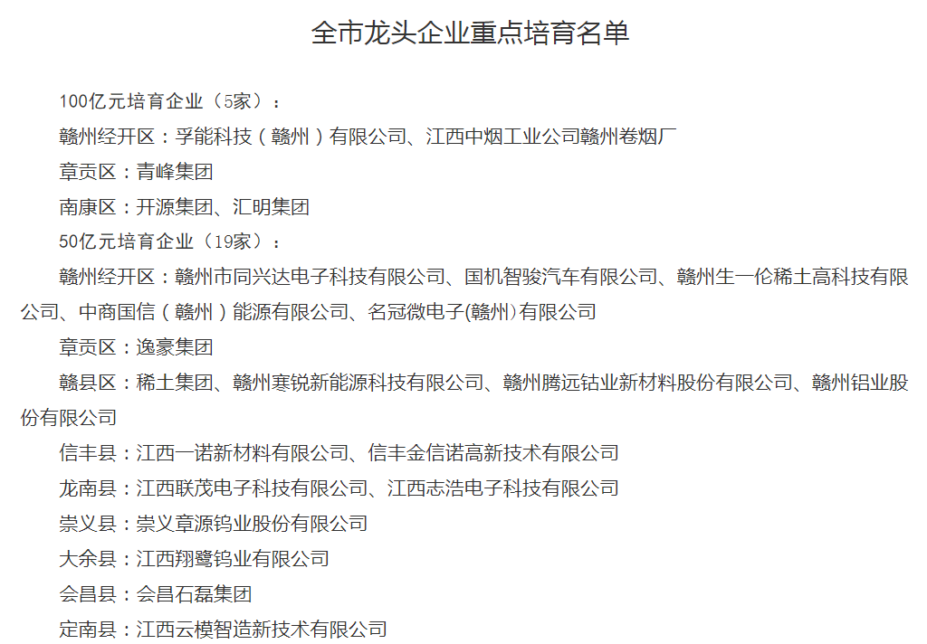 通知里講到,為深入貫徹贛州市市委、市政府“主攻工業(yè),三年再翻番”決策部署,全力培育一批營(yíng)業(yè)收入超50億元、100億元的大型龍頭企業(yè),引領(lǐng) “兩城兩谷兩帶”產(chǎn)業(yè)轉(zhuǎn)型升級(jí)、做大做強(qiáng),推動(dòng)贛州市工業(yè)經(jīng)濟(jì)高質(zhì)量跨越式發(fā)展。