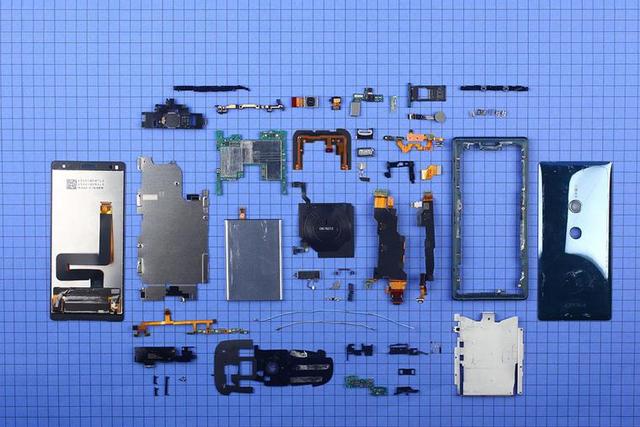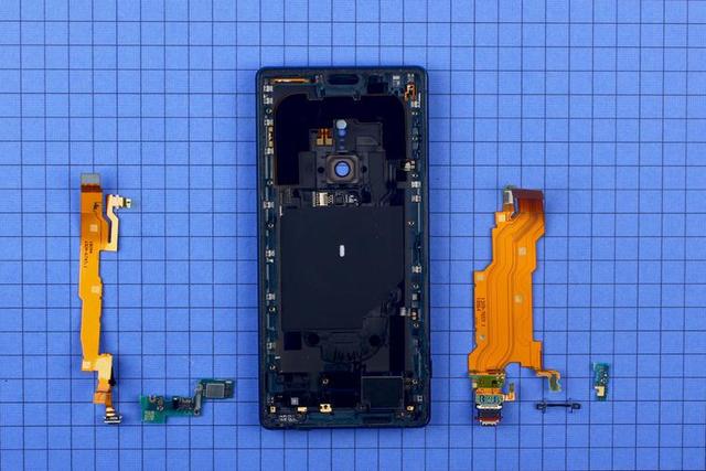 擰下螺絲將蓋板取下,內(nèi)部結(jié)構(gòu)盡在眼前。盡管要從屏幕開(kāi)始拆起,但 Xperia XZ2 采用的依然是安卓手機(jī)非常常見(jiàn)的三段式結(jié)構(gòu), BTB 連接板被設(shè)計(jì)到電池下方,使得整體觀感變得整齊劃一。