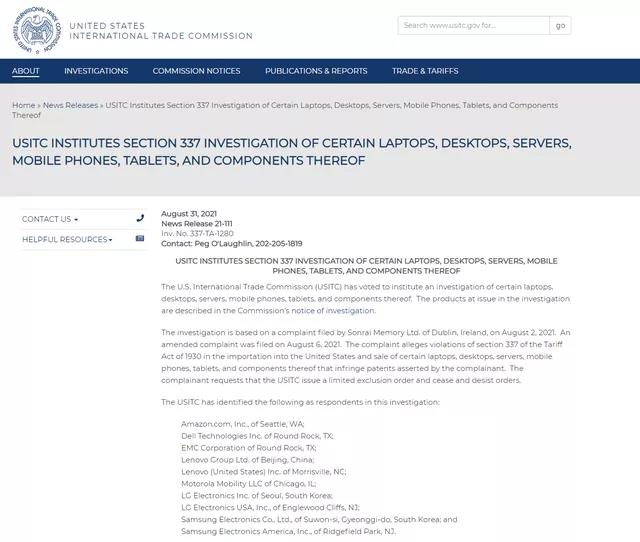 據(jù)柔性電路板小編了解,此次調(diào)查主要由愛爾蘭 Sonrai Memory 發(fā)起申請,聲稱這些公司正在制造或銷售在海外制造的筆記本電腦、臺式機和手機,這些筆記本電腦、臺式機和手機侵犯了其三項專利。