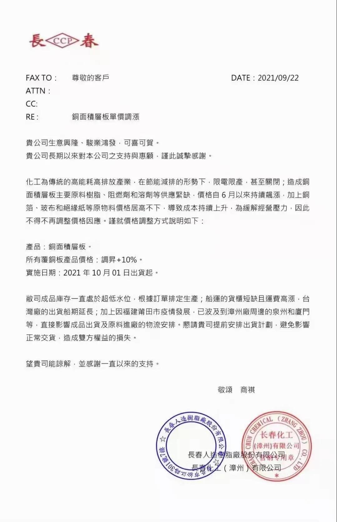 近日,據(jù)軟板廠了解,長(zhǎng)春發(fā)布銅面積層板單價(jià)調(diào)漲通知,從2021年10月1日起,所有覆銅板產(chǎn)品價(jià)格調(diào)升+10%;9月初,以建滔積層板為首的多家覆銅板廠商先后宣布調(diào)漲覆銅板價(jià)格,而早在8月份,生益科技也宣布調(diào)漲了覆銅板價(jià)格。新一輪的漲價(jià)誘因并不是需求驅(qū)動(dòng),而是原材料端價(jià)格不斷上漲所致。