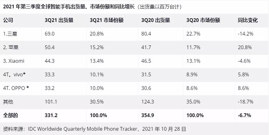 先來(lái)看整體情況,由于受到缺芯或其它元器件的影響,第三季度手機(jī)總出貨量3.312億部,同比下滑6.7%,比之前預(yù)期的還要低。