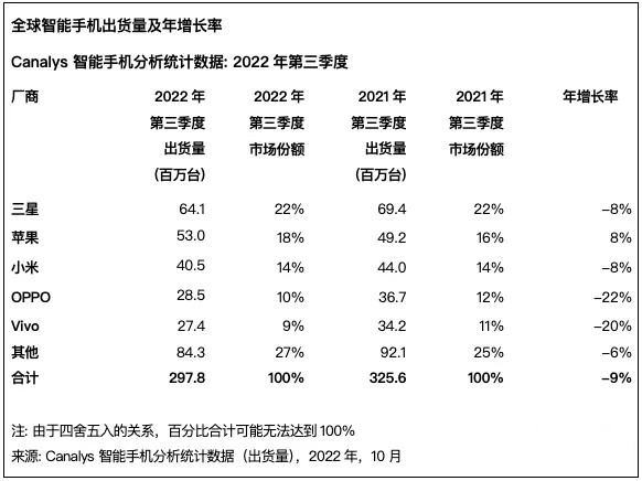 2022年第三季度全球智能手機(jī)出貨量同比下降12%,為3.01億部。