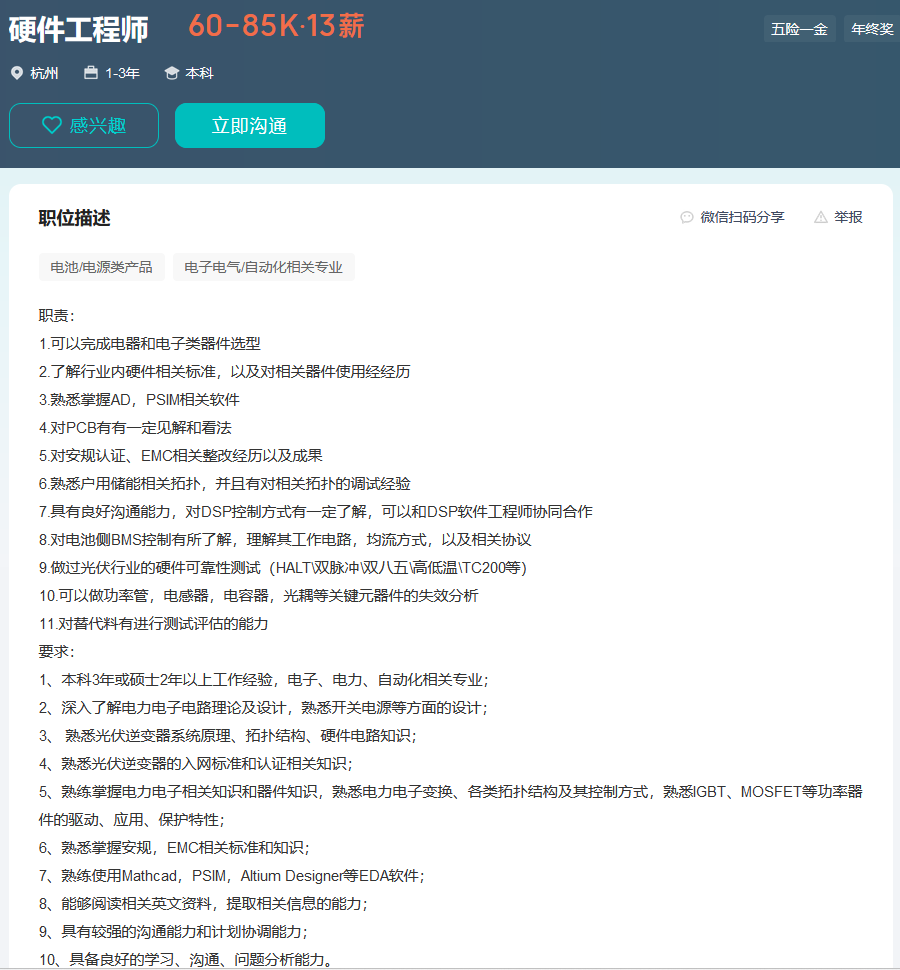 FPC廠了解到,新能源公司硬件工程師,60-85K·13薪 (杭州):