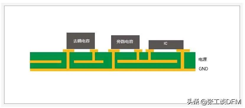 旁路電容旁路噪聲并減少電源總線的波動,放置在靠近設(shè)備或者IC的位置。連接在電源和接地之間,補償許多IC同時開關(guān)電源和接地層電勢的變化。