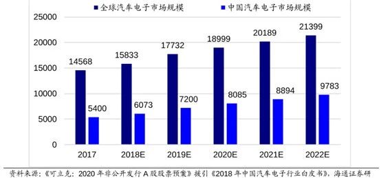 全球和中國汽車電子市場規(guī)模(億元)