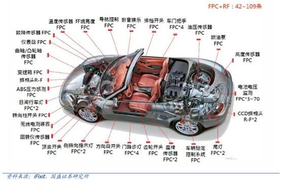 可以看到,汽車電子中FPC可使用于儀表盤、變速箱、行車燈、電池系統(tǒng)、影音娛樂、導(dǎo)航控制、座椅傳感、轉(zhuǎn)向開關(guān)、方向盤等幾十個位置,成為汽車中電子設(shè)備能夠正常工作的關(guān)鍵。