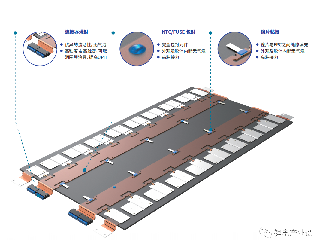 電池連接系統(tǒng)需要保證密封性和安全性,如高壓連接器、NTC、鎳片、Fuse等部件。高效方案是采用點膠工藝,對材料特性的要求很高,首先是在生產(chǎn)過程中,要保證粘合劑可以完全固化,優(yōu)異的流動性填充連接器內(nèi)部,另外不能對塑膠基材微腐蝕,否則會導致失效,如粘接不足元器件脫落、離子遷移焊點腐蝕、粘合劑材料表面溶蝕、連接器耐壓失效等。