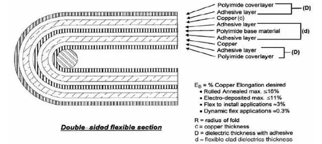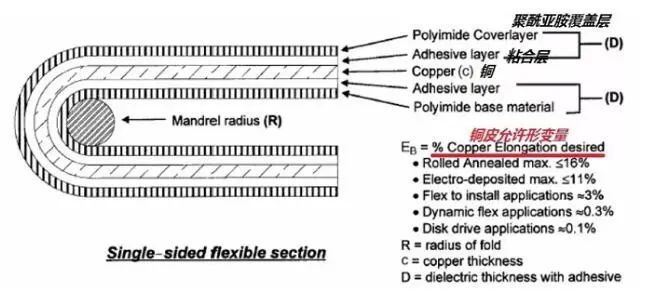 其中:R=最小彎曲半徑、單位µm、c=銅皮厚度、單位µm、D=覆蓋膜厚度、單位µm、EB=銅皮變形量,以百分數(shù)衡量。