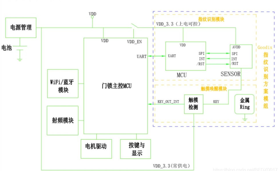 2、為了降低系統(tǒng)的待機(jī)功耗,系統(tǒng)在休眠時(shí),指紋識(shí)別模塊斷電不工作。觸摸喚醒模塊