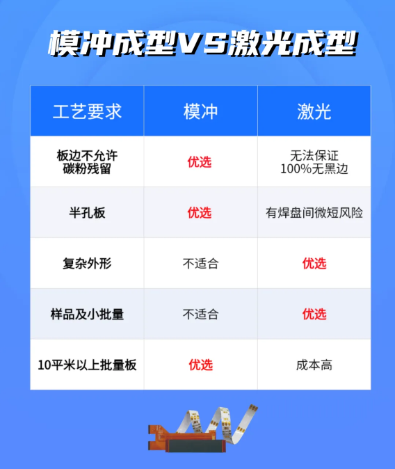 軟板模沖成型模沖沒(méi)有激光碳粉殘留問(wèn)題,半孔板也不會(huì)有半孔焊盤(pán)之間存在碳粉殘留導(dǎo)致的微短問(wèn)題,可配自動(dòng)沖床,生產(chǎn)效率高,成本低,但要開(kāi)模具,適合大批量板。