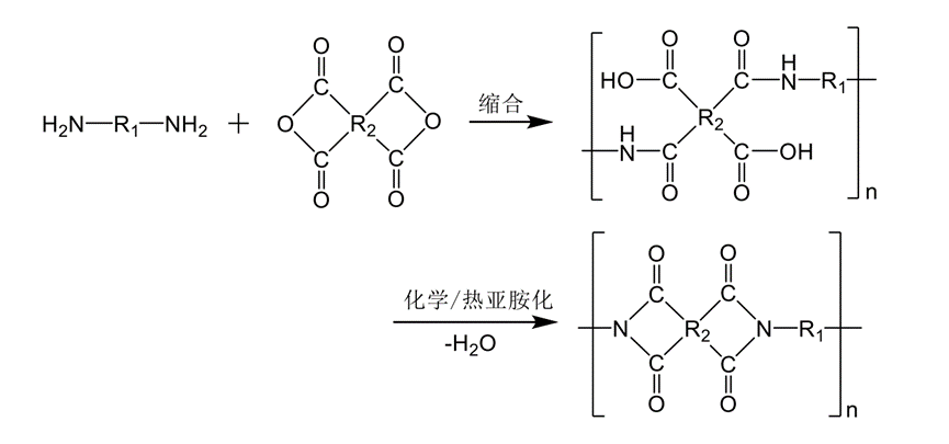 PI 作為一種具有優(yōu)異綜合性能的特種工程塑料,主要特征是其主鏈上含有酰亞胺環(huán),通常是由二胺和二酐單體在非質(zhì)子極性有機溶劑中低溫縮聚反應(yīng)生成聚酰胺酸溶液,再脫水環(huán)化而得。